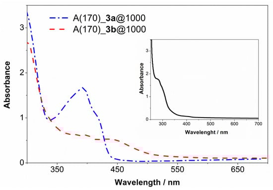 Previous studies showed the potential of A(170) OIH matrices to be doped with chemosensors due to the transparency of the samples in the visible region []. This type of matrix was already doped with a triarylimidazole with no changes in its intrinsic properties. In this work, colorimetric and fluorimetric pH imidazole chemosensors were used to dope the A(170) films, to assess whether the doping changes the properties of the matrix or not, which was analyzed by UV/Vis spectroscopy. The OIH’s spectra shown in Figure 9 were normalized to the thickness of each film and the UV/Vis spectra of pure A(170) sol–gel film is shown in the inset. The spectra of A(170)_3a@1000 and A(170)_3b@1000 are shown in Figure 9.
