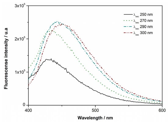 Photoluminescence spectra obtained for pure OIH material (A(170)) []. The pure OIH material (A(170)) shows an intrinsic emission []. This intrinsic emission is linked to the OIH matrices due to the photoinduced proton transfer between defects NH3+/NH− and due to the electron−hole recombination occurring in the siloxane nanoclusters. Figure 10 shows that the wavelength of the emission peak displaces slightly to higher wavelengths when the excitation wavelength increases for the pure matrix. The intrinsic emission is dependent on the excitation energy, since it is connected to unorganized processes that are generally linked to transitions that occur between localized states in non-crystalline structures. With excitation at 290 nm, the spectra show a maximum emission peak at 442 nm.