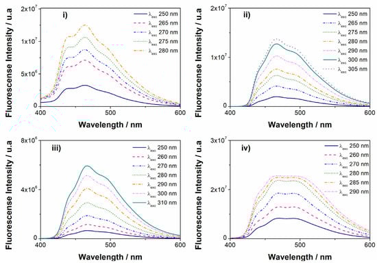 Figure 11 shows the photoluminescence spectra obtained for the four A(170)_3a OIH matrices. The spectra of A(170)_3a@500 (Figure 11i) show a fluorescence profile that is similar with the different excitation wavelengths. The first band seen at around 440 nm may belong to the intrinsic emission of the matrix, but 3a also contributes to increase the fluorescence of the OIH materials. The peak of 3a is not well defined, which is expected, since OIH materials are a biphasic system i.e., organic, and inorganic components are mixed at nanometric scale, and the presence of imidazole may contribute to a higher light scattering that may lead to changes within the sample and to a general broadening of the peaks. In the other spectra, there can be seen a higher proportion between the main peak at around 460 nm and the peak corresponding to the matrix. In all the cases, a synergetic effect between the intrinsic emission of the matrix and the fluorescence of 3a is seen on the fluorescence profile of the doped matrices.