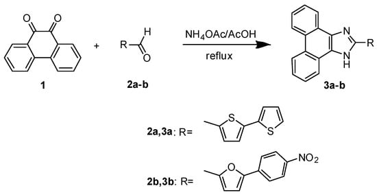 Imidazole derivative 3a was synthesized through the Radziszewski reaction of 9,10-phenanthrenedione 1 and heterocyclic aldehyde 2a, as previously reported []. Compound 3b was synthesized by the same method, by reacting 9,10-phenanthrenedione 1 with the heterocyclic aldehyde 2b and ammonium acetate in refluxing glacial acetic acid for 8 h. The pure imidazole derivative 3b was obtained as an orange solid with a yield of 80% after recrystallization from acetone/petroleum ether (Scheme 2). The new compound was completely characterized by NMR, IR, and UV-vis spectroscopies. The absorption (λmax = 390 nm) spectra of imidazole 3b was measured in acetonitrile solution. The study of the fluorescence of compound 3b was also performed in acetonitrile solution using DPA as standard []. Unlike imidazole 3a (ΦF = 0.50) [], 3b does not show fluorescence. The absence of detectable fluorescence for the push–pull imidazole 3b functionalized with the nitro group is probably due to a high rate of S1 → S0 internal conversion, which may be related with the considerable charge-transfer character of the excited state, as a result of the strong electron-withdrawing power of the –NO2 group [].