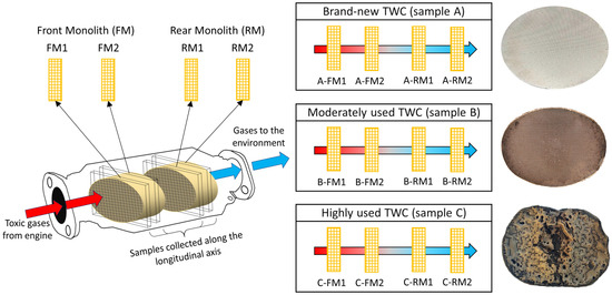 We studied samples from three TWCs of sedan-type commercial automobiles. Samples were taken from A: brand-new (Nissan, Versa 2019), B: moderately used (Dodge, Atos 2014) and C: highly used TWC (Honda, Accord 2009). The mileages for B and C catalytic devices were 74,500 and 125,000 mi, respectively. The used B-TWC was circulating in Mexico City. In this city, vehicle emission regulations require the drivers to substitute the catalytic converter when the efficiency of toxic gas conversion is insufficient to comply with PROY-NOM-167-SEMARNAT-2016 guidelines [24]. On the other hand, the used C-TWC corresponds to a car circulating in Hermosillo without TWC replacement regulations.
