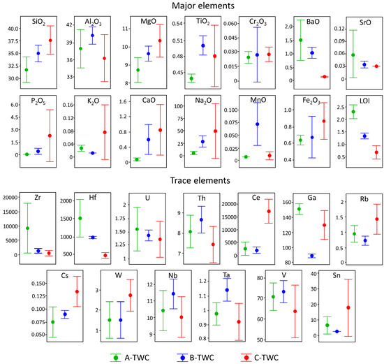 Boxplot of the major (wt%, vertical axis) and trace elements concentrations (ppm, vertical axis) of the studied samples. 95% CI for the mean, individual standard deviations were used to calculate the intervals.