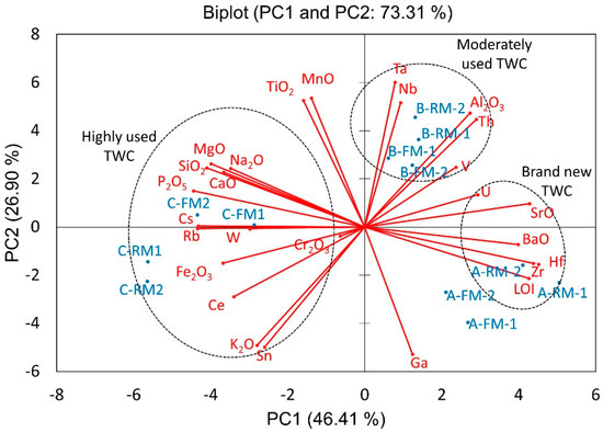 Principal component analysis (PCA) loadings of chemical composition and the studied TWCs. Enclosed ellipses correspond to chemical elements associated with each sample.