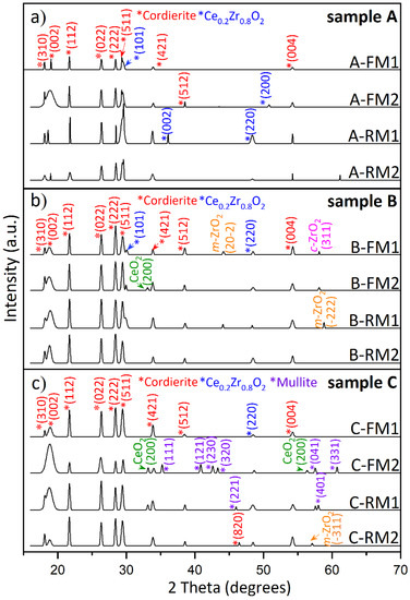 The X-ray diffraction profiles (XRD) of the three TWCs are presented in Figure 5. The diffraction pattern for the A-TWC shows characteristic cordierite peaks at 18.0°, 18.97°, 21.66°, 21.72°, 26.44°, 28.46°, 29.42°, 33.76° and 38.50°, corresponding to the planes (310), (002), (112), (022), (222), (511), (421), (512), (004) (Figure 5a). The peaks of Ce0.2Zr0.8O2, associated with the planes (101), (200) and (002), (220), were observed in the new TWC. In the same way, the cordierite and Ce0.2Zr0.8O2 peaks are observed in both the B-TWC and C-TWC. Besides, the used TWC show peaks of cubic ZrO2 (58.06°), monoclinic ZrO2 (44.13°, 57.1° and 58.79°) and CeO2 (33.08° and 56.34°) (Figure 5b,c), which supports the separation of ZrO2 and CeO2 phases [27].