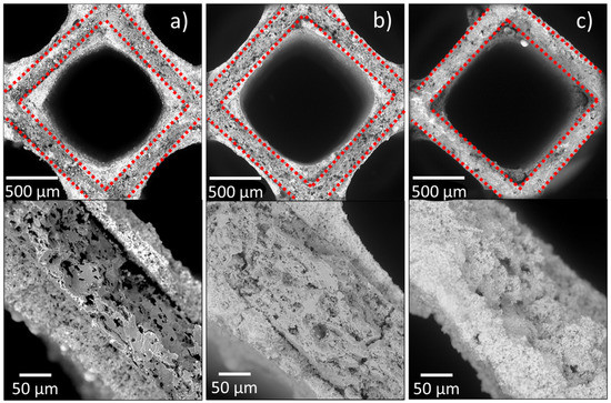 SEM images at different magnifications from (a) brand-new TWC, (b) moderately used TWC, (c) highly used TWC. Red dashed line separates the internal monolith and the external catalytic layer. The loss of the outer catalytic layer is proportional to the use.