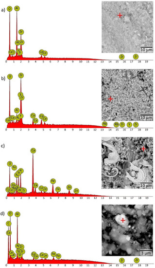 The EDS analysis of the external catalytic layer shows that sample A-TWC contains microcrystals made up of O, Zr, Al, Ce and Si (Figure 7a). Particles of the B-TWC are composed of Zr, O, Ce, Y, Al, Ca and Rb (Figure 7b), while C-TWC gives O, Ca, Zn, Fe, P, Al, Si and Ce (Figure 7c). These results support the chemical poisoning observed in the chemical analysis. Moreover, significant heterogeneity in the size of the C-TWC particles is evident, including fragments up to 10 µm.