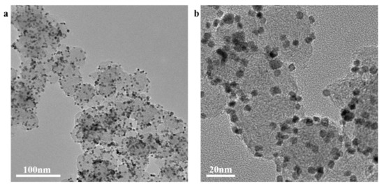 The TEM images of Pt3Ni/C composite material: (a) magnification is 60,000 times; (b) magnification is 200,000 times.