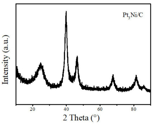 The morphology of the samples analyzed by a transmission electron microscope (TEM) is shown in Figure 2. Pt3Ni particles with a size range from 5 nm to 10 nm are uniformly supported on the Super P, which is beneficial to enhance the conductivity of the composite material, increasing the contact area with lithium polysulfide, and promoting the conversion of lithium polysulfide. As shown in Figure 3, it is the XRD pattern of Pt3Ni@C composite material. By comparing the XRD patterns, all the diffraction peaks are consistent with those of Pt3Ni@C prepared by Y. Liu et al. [38], indicating that the Pt3Ni@C composite material was successfully synthesized.