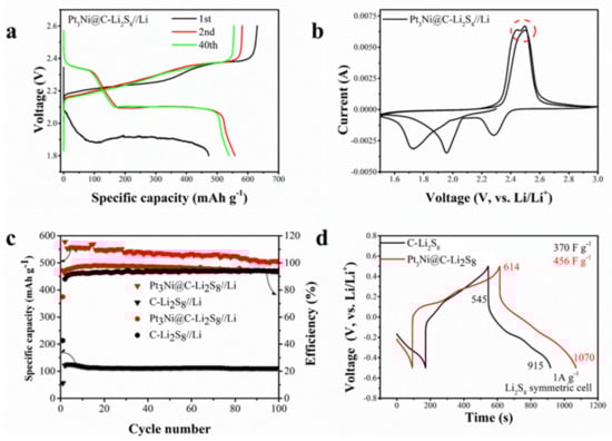 (a) Charge and discharge curve. (b) Cyclic voltammetry curve (scan rate 0.1 mV s−1) of Pt3Ni composite material as cathode working electrode. The peak current is marked with a red dotted circle. (c) Cycle performance of Pt3Ni composite material and C as cathode working electrode. (d) Pt3Ni@C-Li2S8 and C-Li2S8 symmetric battery capacitance curves.