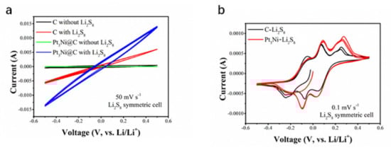In order to verify that the Pt3Ni@C composite material can promote the conversion of lithium polysulfide, a symmetric battery test was carried out. It can be seen from Figure 4d that the battery capacitance of Pt3Ni@C with Li2S8 (456 F g−1) was greater than that of C with Li2S8 (370 F g−1), which showed that Pt3Ni@C could adsorb more lithium polysulfide and had more reaction sites. The CV measurements of these symmetric batteries were performed between −0.5 V and 0.5 V at a scan rate of 50 mV s−1 and 0.1 mV s−1, respectably, and the results were shown in Figure 5. Regardless of the fast scan rate of 50 mV s−1 (electrochemical polarization control), as shown in Figure 5a, or the slow scan rate of 0.1 mV s−1 (concentration polarization control), as shown in Figure 5b, the current responses of Pt3Ni@C symmetrical battery are higher than that of the C, demonstrating that Pt3Ni@C can facilitate the electrochemical conversion of polysulfide [12,23,37].