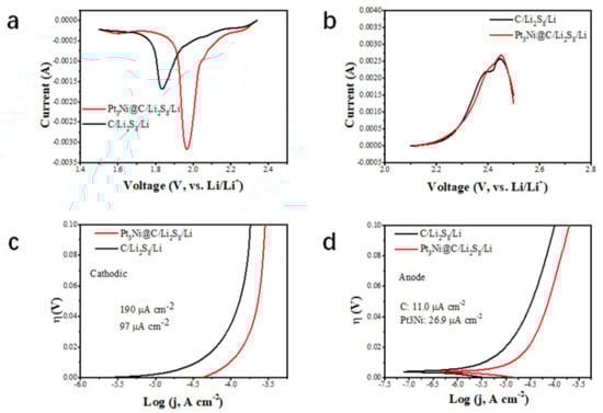 The reduction peak of CV corresponds to the conversion of long-chain lithium polysulfide to short chain, and the oxidation peak corresponds to the conversion of short-chain Li2S2 and Li2S to long-chain. Comparing the CV curves of Pt3Ni@C-Li2S8//Li and C-Li2S8//Li (Figure 6a,b), the peak current of the Pt3Ni@C-Li2S8//Li increased and the peak position of the Pt3Ni@C-Li2S8//Li was shifted positively, which indicated that Pt3Ni@C had good catalytic activity for the conversion process of lithium polysulfide. The negative sweep and positive sweep Tafel curves of Pt3Ni@C-Li2S8//Li and C-Li2S8//Li were shown in Figure 6c,d. It was demonstrated that when Pt3Ni@C-Li2S8//Li and C-Li2S8//Li were cathodic polarization, the exchange current densities were 190 mA cm−2 and 97 mA cm−2, respectively. When Pt3Ni@C-Li2S8//Li and C-Li2S8//Li were anodic polarization, the exchange current densities were 26.9 mA cm−2 and 11.0 mA cm−2, respectively. Whether it is cathodic polarization or anodic polarization, the exchange current density of Pt3Ni@C-Li2S8//Li more exceeded that of C-Li2S8//Li, indicating that Pt3Ni@C has a strong ability to acquire and lose electrons, thus equipping with a better catalytic activity.