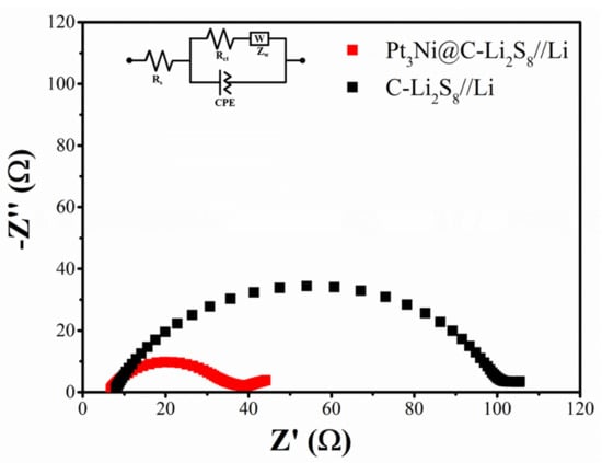 As shown in Figure 7, it was electrochemical impedance spectroscopy of Pt3Ni@C-Li2S8//Li and C-Li2S8//Li. The Nyquist plots of Pt3Ni@C-Li2S8//Li and C-Li2S8//Li before cycling were consisted of a depressed semicircle and an inclined line, corresponding to charge transfer resistance and mass transfer resistance, respectively. The semicircle of Pt3Ni@C-Li2S8//Li was much smaller than that of C-Li2S8//Li, indicating that the charge transfer resistance of Pt3Ni@C-Li2S8//Li was also relatively lower. It was indicated furthermore Pt3Ni@C as the working electrode had better catalytic activity to improve electrochemical kinetics.