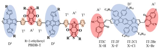 The molecular structures of electron donor PBDB-T, electron acceptors ITIC and IT-2X (X = F, Cl, Br). The polymer donor PBDB-T includes two repeat units. The molecules of electron donor and acceptor materials include electron donor fragments, acceptor fragments and thiophene units that connect the donor and acceptor fragments (labeled D, A, and T1 in the figure). The fragments D1 and D2 are electron donor moieties; the fragments A1 and A2 are electron acceptor moieties.