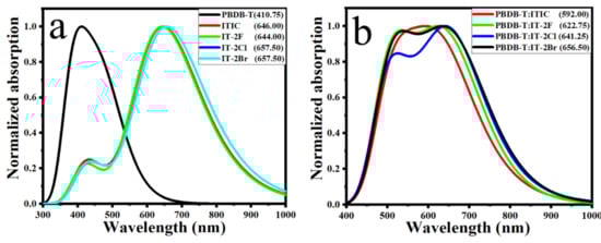 It was observed that the electron donor PBDB-T film exhibited good complementary absorption with those of acceptor ITIC and IT-2X (X = F, Cl, Br) [40]. PBDB-T has a good absorption characteristic in the region of 450–650 nm with absorption peaks at 615.5 nm and 567.5 nm, respectively. The absorption ranges of ITIC and IT-2X (X = F, Cl, Br) are between 600–815 nm. The complementary absorption of donor and acceptor in organic heterojunction are favorable to improve Jsc by enhancing photon harvest [68]. The simulated absorption spectrum presented in Figure 2 well reproduced experimental results, including absorption profile, the wavelength at absorption maxima (λmax) and relative shift among IT-2X (X = F, Cl, Br). For instance, the λmax of IT-2F is blue shifted 13.5 nm relative to those of IT-2Cl and IT-2Br, agreeing well with that of experimental 14 nm excellently [40].