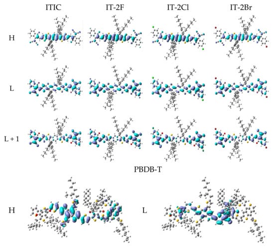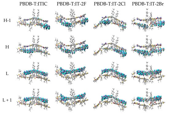 The selected frontier molecular orbitals for PBDB-T:ITIC and PBDB-T:IT-2X (X = F, Cl, Br) complexes. (LC-PBE/6-31G**, ω = 0.155, 0.167, 0.144, 0.155 Bohr−1; α = 0.200, β = 0.086; εs = 3.5, εd = 3.3; H = HOMO, L = LUMO).