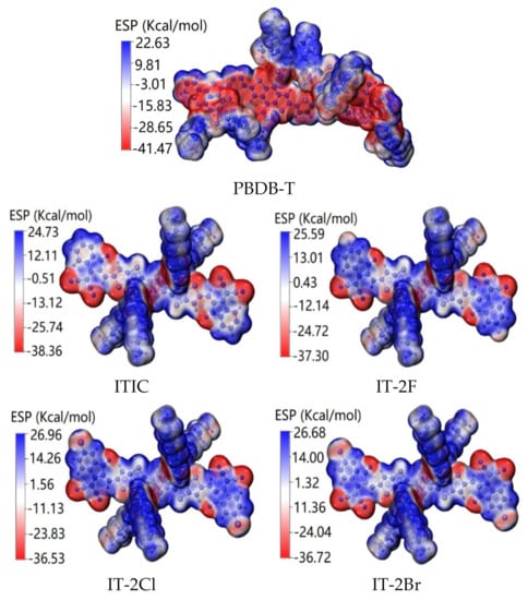 Figure 4 shows the ESP of ITIC, IT-2X (X = F, Cl, Br), and PBDB-T molecules. For PBDB-T, the low ESP is mainly contributed by backbone, and the high ESP is dominated by side chains. For ITIC and IT-2X (X = F, Cl, Br), the high ESP are mainly contributed by alkyl in side-chains, and the low ESP mainly concentrate on O, S, and N atoms in backbone. Moreover, halogenation reduces the ESP at substitution sites. The average ESP values are −48.6, 63.8, 85.3, 105.9 and 106.4 Kcal/mol for PBDB-T, ITIC, IT-2F, IT-2Cl, and IT-2Br, respectively. Since the increased average ESP value of electron acceptor can increase the electron accepting ability [69], the halogenation of ITIC promotes their electron accepting ability, which is favorable for enhancing CT between donor-acceptor complexes [32]. Furthermore, halogenation of ITIC also generate the enlarged ESP differences between donor and acceptors, and further induce stronger interface electric field that can promote the ED and CT at the donor-acceptor interface [33]. Moreover, the enlarged ESP difference between donor and acceptors may also suppressing non-radiation recombination (which was regarded as one of the important energetic losses route in OPV) [70].