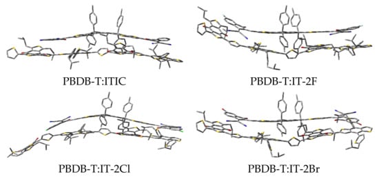 The optimized structures of PBDB-T:ITIC and PBDB-T:IT-2X (X = F, Cl, Br) complexes. (ωB97XD/6-31G**).