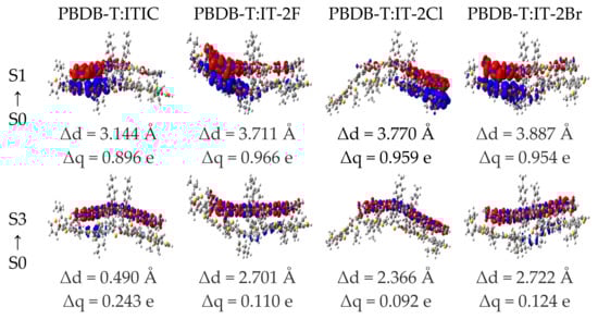 The Δq and Δd of the PBDB-T:ITIC and PBDB-T:IT-2X (X = F, Cl, Br) complexes are also calculated to quantitatively describe the CT and LE of the complexes. The CDD, Δq and Δd of the selected excited states are given in Figure 7 (more details to see Figure S5 in SM). Apparently, the Δq labeled in Figure 7 and Figure S4 support the assignments of excited state characters. The halogenation of the complexes increases Δq of CT excitations. The Δd for most of excited CT states are in range of typical intermolecular distances between donor and acceptor in organic photovoltaic heterojunctions. Furthermore, the order of Δq related to S1 states of the halogenated complexes is same as that of experimental JSC [40]. The Δq was demonstrated as one of the critical factors to determine JSC [79].