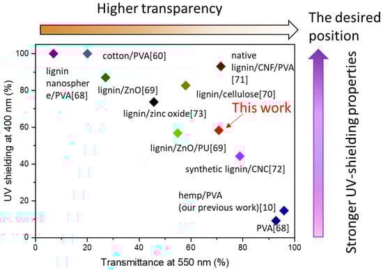 - Zhang, Y.; Remadevi, R.; Hinestroza, J.P.; Wang, X.; Naebe, M. Transparent ultraviolet (UV)-shielding films made from waste hemp hurd and polyvinyl alcohol (PVA). Polymers 2020, 12, 1190. [Google Scholar] [CrossRef] [PubMed]