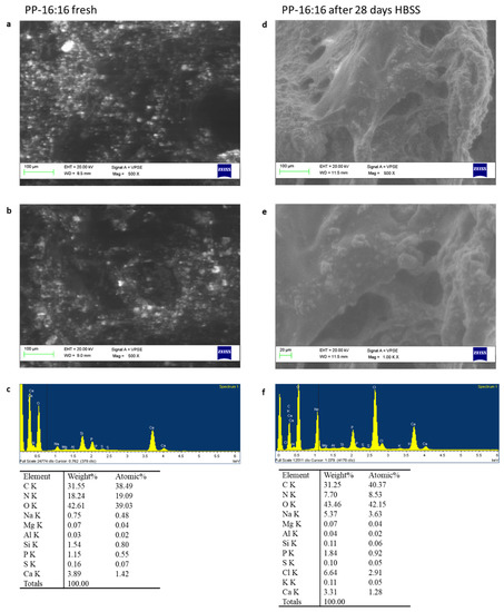 ESEM-EDX analysis at 500× (a) and 1000× (b) of PP-16:16 formulation before and after immersion in HBSS. The analysis on fresh samples revealed a regular surface with low porosities. EDX revealed the constitutional elements of the mineral filled hydrogels (c). After 28 days immersion in HBSS, ESEM at 500× (d) and 1000× (e) revealed the presence of larger circular and elliptic pores (20–120 µm range) and the formation of a mineral layer. EDX analysis evidenced an increase of P (from HBSS) and a decrease of Si (from the mineral powder) (f).