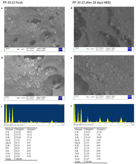 After 28 days HBSS immersion, surface morphology at 500× and 1000× magnification showed a higher porosity, with circular and elliptic pores, ranging from 20 to 120 µm (Figure 2d,e). EDX revealed constitutive elements of the natural polymers, namely C, O, and N, sodium (Na) and of the mineral phase, namely Ca and P. A marked Si decrease was detected. Traces of chlorine (Cl) from HBSS solution were also detected (Figure 2f).