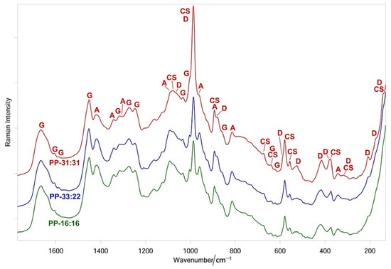 Micro-Raman spectra were obtained by using an NRS-2000C Jasco spectrometer (Jasco Inc., Easton, MD, USA) with a microscope of 100× magnification. All the spectra were recorded in back-scattering conditions with 5 cm−1 spectral resolution by using the 532 nm green diode-pumped solid-state laser driver (RgBLase LLC, Fremont, CA, USA) with a power of about 20 mW. A 160 K cooled digital charge-coupled device (Spec-10: 100B, Roper Scientific Inc., Sarasota, FL, USA) was used as a detector. Due to the poor quality of the micro-Raman spectra of the fresh samples, this technique was only used to investigate the presence of a mineral deposition on the hydrogels, in addition to FT-Raman spectroscopy. This technique was also used to characterize the fresh samples and to disclose possible interactions between the phases through the comparative analysis of the spectra.
