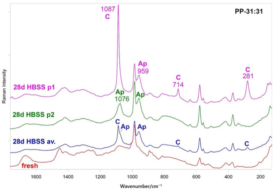 Set fresh samples and samples aged 28 days in HBSS were analysed by ESEM-EDX, FT-Raman, and micro-Raman.
