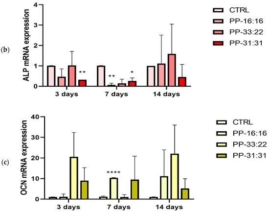 Calcium release values of the hydrogels are reported in Table 2. High calcium ions release values were observed from the first hours following immersion (3 h), with a significant increase up to the first three days. During this period, PP-31:31 revealed the highest values after one day, followed by PP-33:22 and PP-16:16, significantly different from PP-CTRL (p < 0.05).