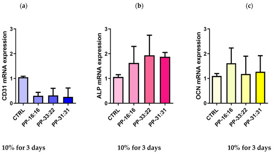 Hydrogels disks (PP-16:16, PP-33:22, PP-31:31) were placed into the wells in contact with MSCs and cultured for 3, 7, and 14 days. The culture medium was changed every 3 days. MSCs cultured without hydrogels were used as control. These experiments were used to evaluate the effects of hydrogels on vasculogenic and osteogenic MSCs differentiation.