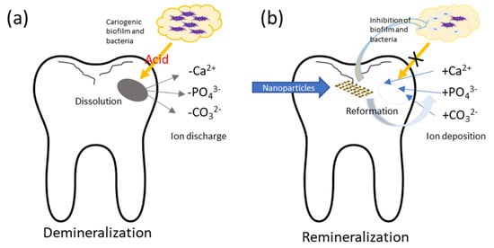 Dental decay, or caries, is a prevalent chronic disease that depends on multiple etiologic factors such as cariogenic microbes, host or tooth surface, substrate, and time. Although it is the hardest substance of human tissue, enamel can dissolve in acids. This dissolution or demineralisation of minerals causes the destruction of tooth structure and leads to dental caries (Figure 1a). Individuals are exposed to caries throughout their lifetime [1]. Dental caries is the most common condition among all oral diseases [2,3]. The World Health Organization has reported that dental caries is the fourth most expensive disease to treat, causing a significant global burden of disease [4]. Dental caries is not self-limiting, and without treatment it can advance, causing pain and infection until tooth loss [5]. However, caries is preventable. Preventive measures against dental caries have been remarkably improved in the last few decades. Several dental materials are employed to manage dental caries, including metals, ceramics, polymers, and hybrids. Contemporary nanotechnology has shown great attention in the development of anti-caries agents using nanoparticles.