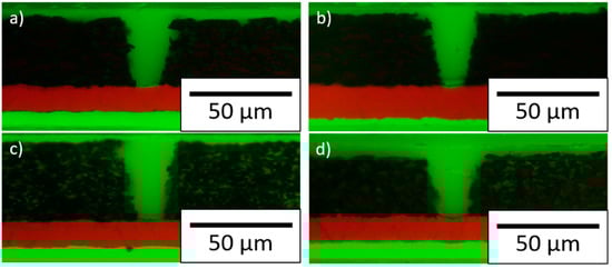 Cross sections of the structured electrodes are shown in Figure 5. The laser patterning process removed the material without damaging the current collector while implementing V-shaped lines. No debris formation on the electrode surface was detected. A line energy of 12 J/m (graphite, TSi, NGP) or 9 J/m (SSN) was applied for ablation. The dimensions of the structures are summarized in Table A1. A maximum aspect ratio of 2 could be achieved. At the top of the electrode, the lines had a mean width of 26.1 µm, while near the current collector they had a width of 11.8 µm.