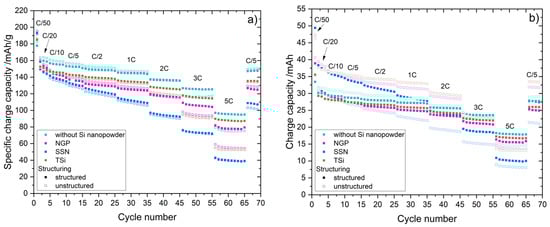 The highest specific capacities during the first formation cycle (C/50) were observed for the SSN electrodes at up to 196 mAh/g. The electrodes without silicon nanoparticles reached the lowest specific capacity of 178 mAh/g at the first formation cycle (C/20). After the first formation cycle, the capacity of all the cells decreased. At the lower C-rates (C/10 to 1C), the cells with unstructured and structured electrodes provided almost the same specific capacity, while at higher C-rates (2C to 5C), the impact of the laser patterning process could be observed, where the cells with structured electrodes had a higher specific capacity compared to those with unstructured ones. The cells with SSN silicon showed the highest drop in capacity with increasing C-rate, and at 5C the specific capacity of the SSN cells only reached approximately 40 mAh/g. The cells with unstructured NGP electrodes had a capacity at 5C ranging from 54 to 60 mAh/g, and the cells with the structured NGP electrodes still reached approximately 80 mAh/g. The cells with unstructured TSi electrodes reached 52 to 55 mAh/g, and the cells with structured TSi electrodes reached 87 to 89 mAh/g. At 5C, the highest specific capacity of 95 to 97 mAh/g was observed for cells with structured graphite electrodes, while the cells with unstructured graphite electrodes reached 75 to 79 mAh/g. The charge capacities of the pouch cells are shown in Figure 7b. The charge capacities of all cells with unstructured electrodes were higher than those with structured electrodes for C-rates up to 2C. At 3C and 5C, the capacity of the cells with structured electrodes was higher. The highest capacity of 49.4 mAh was reached at a C-rate of C/50 for a cell with SSN silicon; however, this cell also showed the highest drop in capacity. At 5C, the cell only had a remaining capacity of 10 mAh. For the pouch cells in general, the higher the capacity at low C-rates (i.e., C/50 and C/20), the lower the capacity at high C-rates (i.e., 3C and 5C).The Coulombic efficiency (CE) of the pouch cells is shown in Figure A8. When the C-rate changed, the CE dropped below 100% for the first cycle at a new C-rate and reached 100% again at the second or third cycle. The structuring reduced this CE drop. For example, at the first cycle of 5C, the unstructured TSi pouch cell had a CE of 60%, while the structured TSi pouch cell had a CE of 76%.