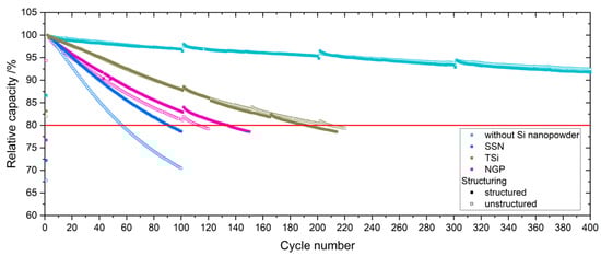 Only the first 400 cycles are shown for the electrodes without silicon. No major differences were observed between the relative capacities of the pouch cells with the structured and unstructured electrodes when only graphite was used as the anode material. When TSi silicon nanopowder was applied, the unstructured cells showed a slightly better performance with a longer lifetime and reached end of life (EoL) at 80% relative capacity after 202 ± 10 cycles, whereas the cells with structured electrodes only reached 182 ± 7 cycles. For NGP and SSN, the structuring of the anodes led to a higher relative capacity of the cells. The cells with unstructured anodes reached EoL after 51 ± 7 cycles and 105 ± 11 cycles for SSN and NGP, respectively. For the cells with structured anodes, the relative capacity dropped under 80% after 77 ± 10 cycles and 131 ± 3 cycles for SSN and NGP, respectively. This meant an increase of lifetime of 50.6% for SSN and 25.1% for NGP, whereas the electrodes with TSi showed a decrease in lifetime of 9.8%. The pouch cells with unstructured and structured reference electrodes did not reach end of life at this point. After 600 full cycles at 1C/1C, the pouch cells with unstructured and structured electrodes showed a relative capacity of 90% and 89%, respectively.