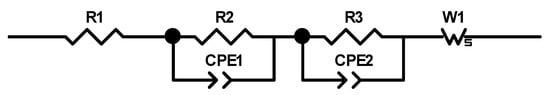 The equivalent circuit used for the interpretation of the EIS data for the coin cells is shown in Figure 9. R1 accounts for the high frequency resistance of the electric contacts and the ionic pore resistance of the separator. The diffusion is represented by a finite length Warburg element W1. Since the measurements did not cover the inductive tail of the spectrum, an inductance was omitted. For the charge transfer processes and the polarization of the SEI, two resistances, R2 and R3, in parallel to constant phase elements (CPE) were chosen. Due to the very porous electrodes that were used in the cells, constant phase elements were chosen instead of capacitors [33].