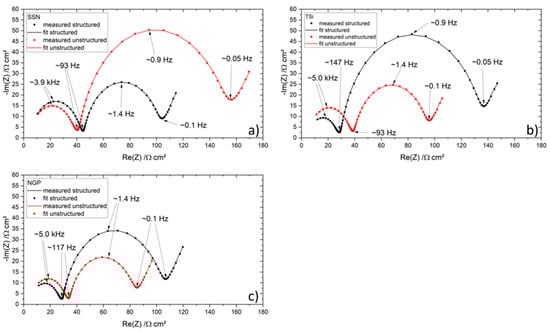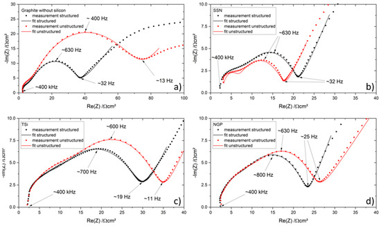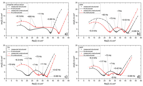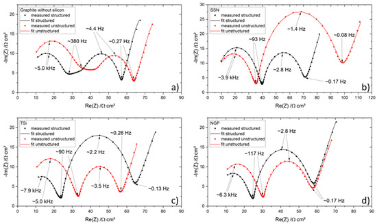 Electrochemical impedance spectra (Nyquist plots) of the coin cells with structured (black) and unstructured (red) electrodes and their corresponding fitting function: (a) pure graphite, (b) SSN, (c) TSi, and (d) NGP.