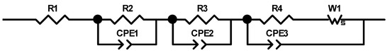 An equivalent circuit with three parallel R-CPE elements in series was used to account for the charge transfer processes of the anode and cathode, and the polarization of the interface between the electrode and the electrolyte due to the SEI [36], which is the most appropriate model for this application [37]. The high frequency resistance of the electric contacts and the ionic pore resistance of the separator was modeled by a resistance, R1. Since the maximal applied frequencies were not sufficient to cover the inductive tail of the spectrum, an inductance was omitted. The diffusion of the lithium ions in the bulk material is represented by a finite length Warburg element W1, which is incorporated in the third R-CPE element. The equivalent circuit is shown in Figure 11.