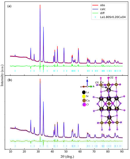 Room temperature of XRD patterns of La2−xSrxCuO4 nanoparticles with x = 0.20 under different sintering conditions (a) sintering condition of 1073 K for 180 min (b) sintering condition of 973 K for 180 min. The inset depicts the schematic figure of the crystal structure of the sample.