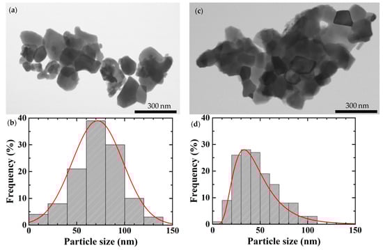 Figure 2 shows the TEM image and particle size distribution of La2−xSrxCuO4 nanoparticles with x = 0.20. The solid line in Figure 2b,d displays the log-normal size distribution fitting result. In the case of the sample with the sintering condition of 1073 K for 180 min, the particle size is distributed from 14.77 to 129.14 nm, with a mean size of 73.08 nm. For the sample with the sintering condition of 973 K for 180 min, the particle size is distributed from 12.65 nm to 104.50 nm, with a mean size of 37.33 nm. The particle size obtained from TEM measurements gave comparable results to those estimated from XRD measurements with a different value of about 4–14%. It is in line with that reported in nano-CoPt3. The particle size measurements using XRD showed a good agreement within 5–7% with the values measured by TEM [].