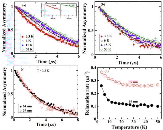 Figure 3a,b shows the time dependence of asymmetry for La2−xSrxCuO4 with x = 0.20 with a particle size of 64 nm and 39 nm, respectively. To ease the reading of the graph, we show asymmetry at 3.3 K, 6 K, 15 K, and 50 K. The time spectra were gradually changed from Gaussian to exponential behavior by decreasing the temperature in both samples. The Gaussian behavior is represented by the time spectra at 3.3 K, while exponential behavior is represented by the time spectra at 50 K. Both time spectra are shown in the inset of Figure 3a. In the bulk state, it is reported that the time spectra did not change from Gaussian to exponential even down to 0.3 K []. The change of the time spectra from Gaussian to exponential with decreasing temperature in La2−xSrxCuO4 nanoparticles with x = 0.20 indicates the slowing down of Cu spin fluctuations. The slowing down of Cu spin fluctuation reveals the magnetic correlation that was developed at low temperatures. In addition, there is no muon-spin precession in both samples down to 3.3 K, indicating the absence of long-range magnetic ordering. It is the addition of Sr to the La site which causes the disappearance of long-range magnetic ordering as reported in the bulk state [,,,]. However, in the bulk state, the slowing down of Cu spin fluctuations at low temperatures was not observed [].