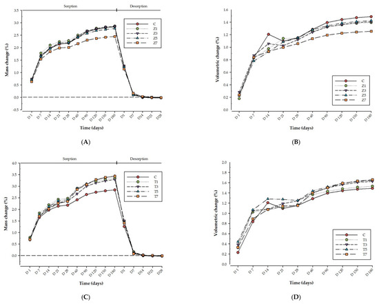 The means and standard deviations of sorption and solubility values are presented in Table 1 and Figure 1. The largest amount of mass and dimensional changes was observed between Day 1 and 7 in all groups. The mass and dimensional magnitudes of water uptake in all groups subsequently increased gradually until they reached equilibrium on Day 180. The mass of the groups rapidly reduced during the desorption cycle until a constant mass was achieved by Day 28. Data on Day 180 of immersion in distilled water indicated that there were no significant variations in the sorption mass change percentage (Ms%) or water sorption (Wsp) in the Z and E groups in comparison to the control Group C (p > 0.05). However, Ms% and Wsp of the T groups were significantly higher than those observed in the control group (p < 0.05). Data after 28 days of desorption revealed that there were no significant differences in the percentage desorption mass change (Md%) or water solubility (Wsl) between the control group and each respective reinforced tested group (p > 0.05). Furthermore, no significant variations in the volumetric shrinkage values (V(%)) between the control group and each respective reinforced tested group were found (p > 0.05).