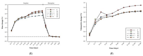 Figure 1. Line graph illustrating the mass change and hygroscopic expansion of each respective tested group with control group (A) mass change for Z group, (B) volumetric change for Z group, (C) mass change for T group, (D) volumetric change for T group, (E) mass change for E group, (F) volumetric change for E group.