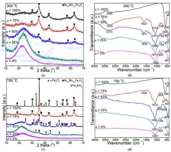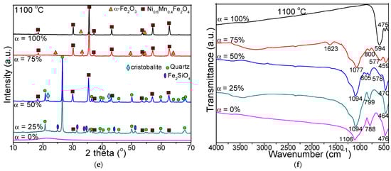 The XRD patterns and FT-IR spectra of the (Ni0.6Mn0.4Fe2O4)α(SiO2)100−α (α = 0, 25, 50, 75, 100%) NCs calcined at 300, 700 and 1100 °C are presented in Figure 1. At all calcination temperatures, in case of NCs with α = 0%, the formation of amorphous SiO2 matrix is supported by the broad halo located at 2θ = 15–30° in the XRD pattern. At 300 °C, the NC with α = 25% is amorphous, the nano-crystalline state developing by increasing the value of α (Figure 1a). In case of the NCs calcined at 700 and 1100 °C (Figure 1c,e), the observed peaks indicate the presence of the cubic spinel structure of MnxNi1−xFe2O4. The MnFe2O4 (JCPDS card no. 74-2403) has a lattice parameter of 8.511 Å, while the NiFe2O4 (JCPDS card no. 10-0325) [12] has a lattice parameter of 8.339 Å. The MnxNi1−xFe2O4 is isostructural with the two structures mentioned above, Ni and Mn being in the same position with an occupancy factor of x for Mn and 1−x for Ni. The reflection planes (220), (311), (222), (400), (422), (511) (440) and (533) belonging to the angular positions at 2θ = 29.99°, 35.33°, 36.83°, 42.87°, 53.11°, 56.65°, 62.16° and 73.38° are consistent with the spinel structure corresponding to the Fd3m space group and match with the literature data [13]. From the positions of diffraction lines for MnxNi1−xFe2O4 result a lattice parameter of 8.44 Å. From the lattice parameter which has a linear dependence with x, results x = 0.6, and Ni0.6Mn0.4Fe2O4.