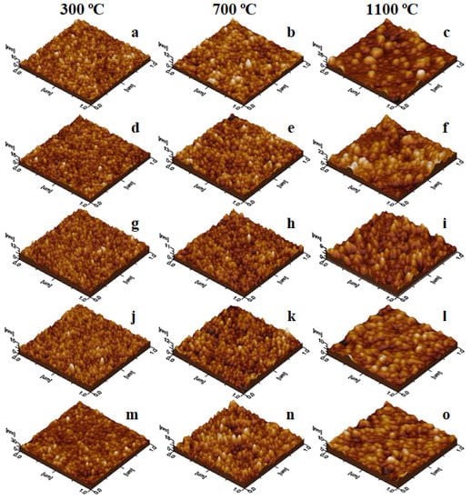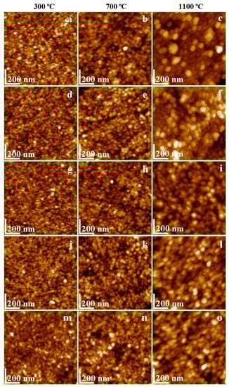 The powder dispersion in an aqueous environment facilitates the nanoparticle arrangement, assuring a uniform adsorption onto the solid substrate creating well-structured thin films [27], as observed in Figure 3a–o. The film roughness depends on the nanoparticle diameter and their disposal on the substrate surface. Thus, the lower roughness values are obtained at 200 °C (Figure 3a,d,g,j,m) due to the uniform adsorption of fine nanoparticles. The particle diameter increases with the calcination temperature, while the adsorbed film uniformity depends on the local heights formed by bigger nanoparticles (Figure 3c,f,i,l).