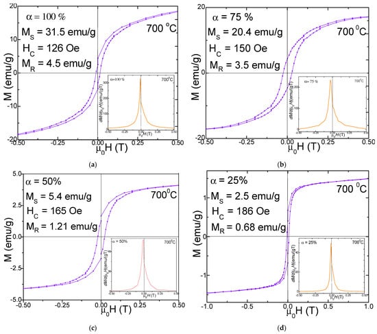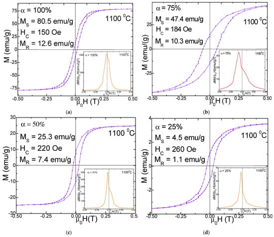 The peaks’ broadening indicates a larger distribution of the particle sizes. For the NCs with α = 25–100%, dM/d(µ0H) vs. H curves have a single and sharp peak. The morphology and the phase purity of NCs, as well as their magnetic properties, are strongly affected by the calcination temperature [3,5]. The SiO2 matrix has diamagnetic behavior for both 700 and 1100 °C calcination temperatures. For the NCs with α = 100% (Ni0.6Mn0.4Fe2O4), typical hysteresis loops for ferromagnetic materials were obtained, for all the calcination temperatures, due to the presence of larger size crystallites and particles as found in XRD and AFM analyses. The unembedded Ni0.6Mn0.4Fe2O4 (α = 100%) has a much higher MS, especially when it is calcined at 1100 °C, than the ferrites embedded in the SiO2 matrix (α = 25–75%), with pretty narrow hysteresis loops, close to a superparamagnetic behavior.