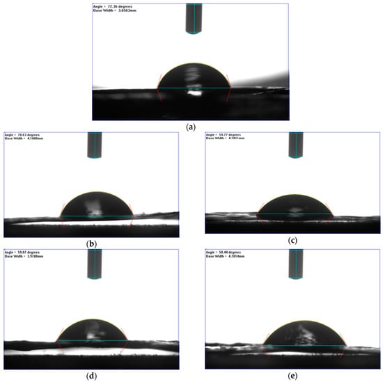 Figure 3 illustrates captured images of water contact angles for surface wettability study, and the corresponding data was tabulated in Table 1. As seen from Figure 3a, a parabola shape of water droplet was observed to have a PD-neat membrane, implying the good surface formation of pure PDLA material. With the incorporation of nanocellulose, PDNC-I (Figure 3b), the shape of water still is able to hold a round parabola shape, similar to PD-neat, despite the hydrophilic criterion of NCC particles. The shape was likely due to the poor distribution of NCC particles on the surface of PDNC-I, and thus reduces its tendency towards water absorption [].