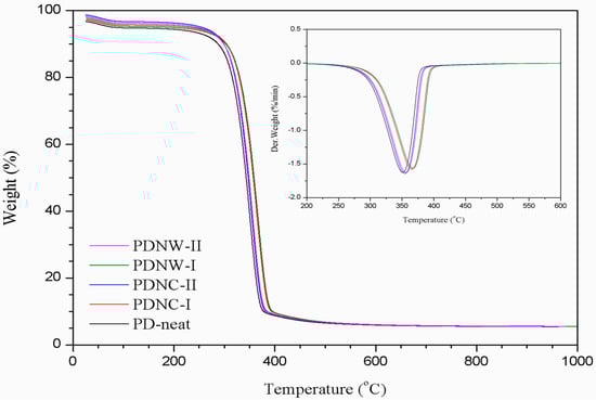 The thermal stability of membranes was evaluated by TGA analysis. From Figure 4, the TGA curve of each sample revealed an initial weight loss, in a temperature range of 60–170 °C. It was considered to be related to the vaporization of water content absorbed by the PDLA membrane. Beyond 250 °C temperature, the samples filled with nanocellulose revealed higher Tonset than the PD-neat sample. This indicated that the introduction of nanocellulose tends to improve the thermal heat resistance of PDLA polymer through hydroxyl groups reactions on both components. Meanwhile, the Tonset were lower for 2 wt.% nano-filled PDNC-II and PDNW-II samples, as compared to their corresponding PDNC-I and PDNW-I samples with 1 wt.% filler loadings (Table 2). This was likely due to a larger amount of nanocellulose with the presence of sulfate groups on the surface, which could induce an earlier thermal decomposition of PDLA molecules []. Furthermore, from the DTG curve, the PDNW-I showed the most stable thermal degradation among those samples, with its Tpeak occurring at 367.4 °C. This also demonstrates that the PDNW-I membrane had promising thermal stability, which would be suitable for a water filtration application process under extreme temperatures.