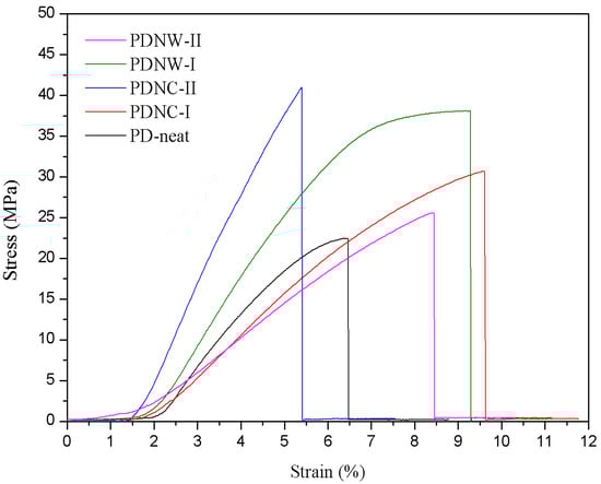 Mechanical stress-strain curves of PD-neat, PDNC-I, PDNC-II, PDNW-I and PDNW-II membranes.