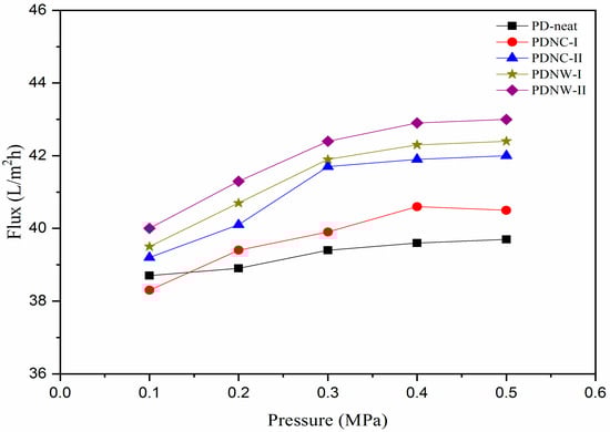 Water flux through membranes applied with different pressures under continuous operation is displayed in Figure 6. In the low applied pressure of 0.1 MPa, only the PDNC-I membrane showed reduced water flux than the PD-neat. With increased pressure to 0.2 MPa, the water flux through PDNC-I exceeded the PD-neat membrane. However, from 0.2 MPa to 0.5 MPa, a fluctuated trend of up-and-down water flux occurred, which can possibly be attributed to the inconsistent pore distribution in the PDNC-I membrane. For the PDNC-II membrane, its water flux penetration dramatically increased from 0.1 MPa to 0.3 MPa and was stabilized thereafter until 0.5 MPa. The gradual increment of water flux in the 0.1–0.3 pressure range was likely promoted by the existence of large voids featured in the PDNC-II membrane. For PDNW-I and PDNW-II membranes, they presented stable water flux increment from 0.1 MPa to 0.5 MPa. From a practicability evaluation standpoint, those CNW-filled membranes possessed higher average water permeability (Pw) of 41.36–41.92 L/m2h, compared to NCC-filled membranes with 39.74–40.98 L/m2h. This demonstrates that the membranes incorporated with CNW particles were more robust to withstand great water flux when applied under different pressures. Additionally, the CNW-filled membranes with high Pw prepared in this work are comparable to the multilayer polyelectrolyte nanofiltration membrane (~20–47 L/m2h) produced by Ouyang et al. [], and also greater than the thermally-crosslinked nanofiltration membrane (<10 L/m2h) generated by Park et al. [], in response to the separation of salts from ionic solution. Therefore, PDNW-I and PDNW-II could be regarded as reliable nanofiltration membranes for salts or metal ion removal purposes in future water treatment applications [].