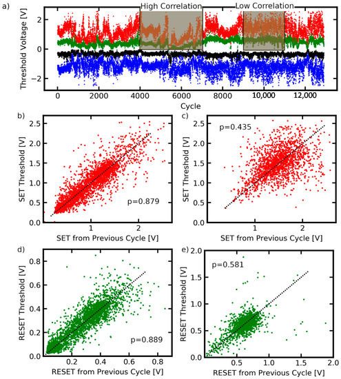 (a) All threshold voltages extracted from the long-term measurement ranging over 12,000 cycles of one memtip sample and plotted against the cycle number. In the indicated high correlation regime (cycles 4000 to 7000) the threshold voltages show a significant dependence on the former values from the previous cycles, resulting in pronounced trends in threshold voltage evolution over several cycles. In a later regime (cycles 9000 to 11,000), which suggests a low correlation, the individual threshold voltages are more independent from each other, and no pronounced trends are observable. The Pearson coefficient quantifies the linear correlation between the individual threshold voltages and the respective former value from the cycle before, for the SET and RESET events in the high correlation regime, (b,d), respectively, and the low correlation regime, (c,e), respectively.