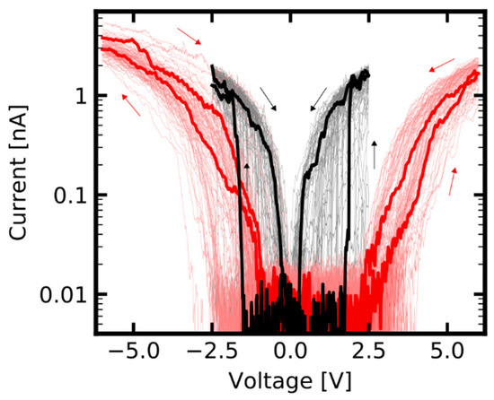 Electrical characteristic of an identical memtip operated over 50 cycles between −2.5 V and +2.5 V on an Au counter electrode (black cycles), and over 50 cycles between −6 V and +6 V on an ITO counter electrode (red cycles). Investigating an identical memtip allows the operation of the very same active filament on different counter electrode materials. For operation on ITO the switching window lies at higher voltages compared to operation on Au.
